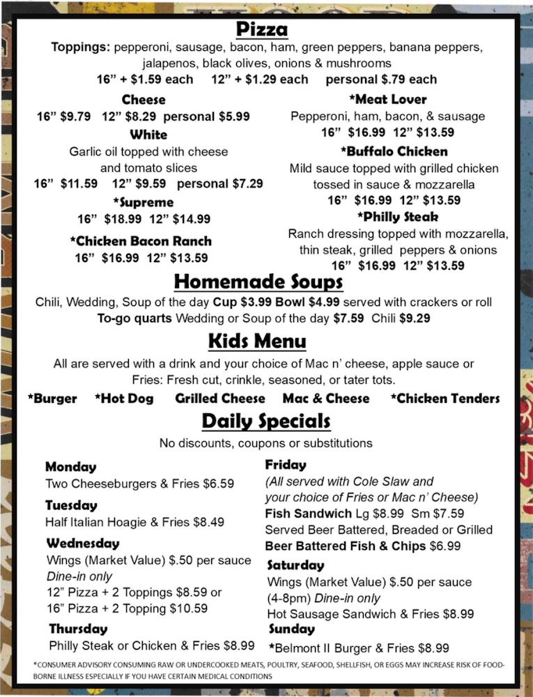 The menu at Belmont II features various delicious options. Enjoy classic comfort food, including burgers, wings, and salads. Delight in fried favorites like homemade onion rings and fried pickles. Daily specials include cheeseburgers and fish sandwiches.